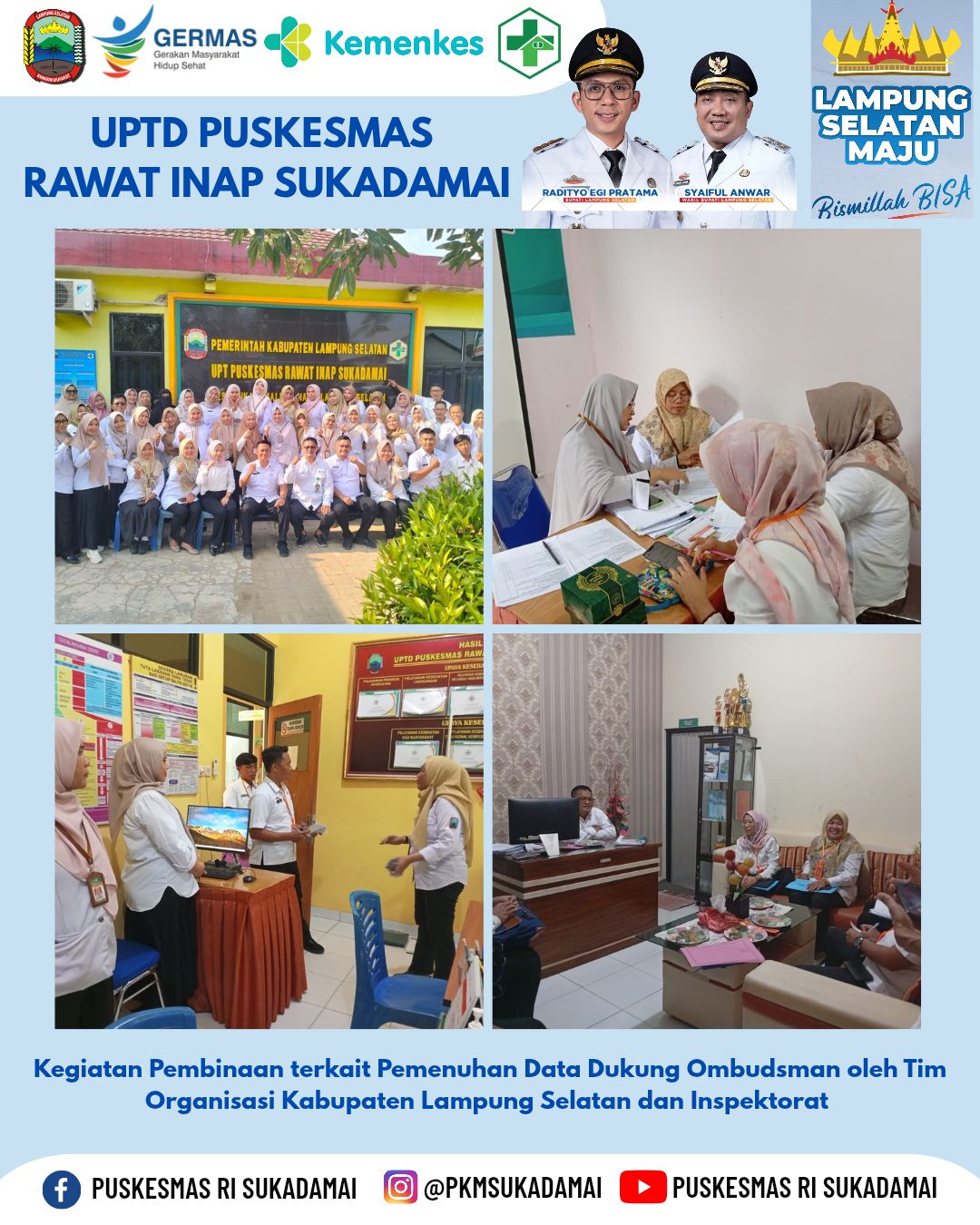 PKMRI Sukadamai — UPTD Puskesmas Rawat Inap Sukadamai menerima kunjungan pembinaan dan review dari Inspektorat serta Bagian Organisasi Pemerintah Kabupaten Lampung Selatan pada Rabu, 7 Mei 2025. Kegiatan ini dilakukan dalam rangka mengevaluasi kualitas pelayanan publik sekaligus meninjau pemenuhan data dukung yang menjadi perhatian utama Ombudsman Republik Indonesia.